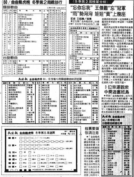 「金曲龍虎榜」1991年冬季第1週榜單於1991年10月19日公佈,內容如下: